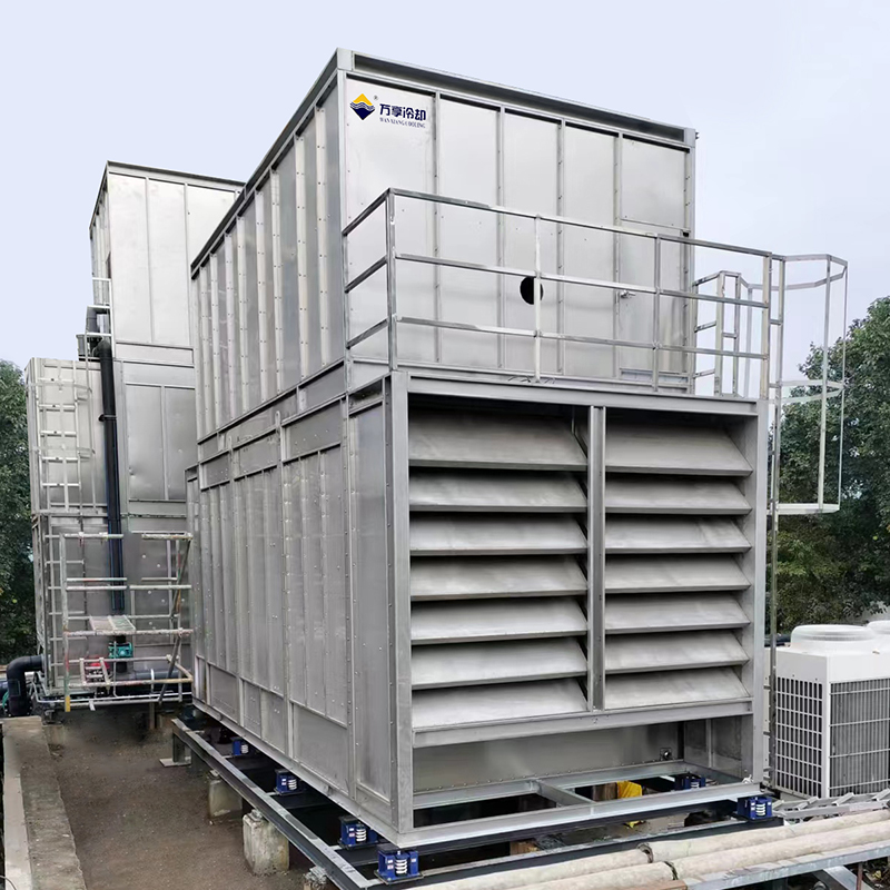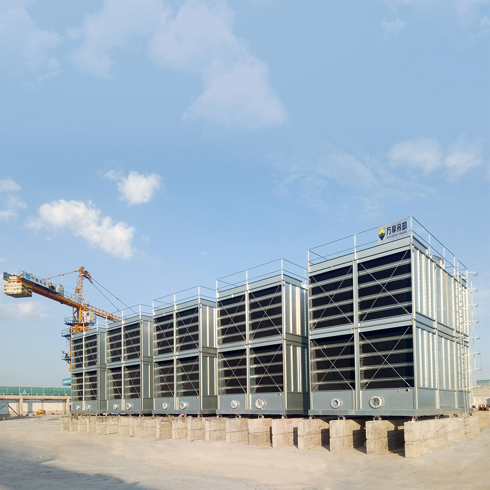 十一届全运会场馆建设所采用的闭式冷却塔,全部采用我公司N型闭式冷却塔,总共使用26台组,冷却水量约3150t/h,图片为运动会前夕设备刚进场待系统安装的施工现场。